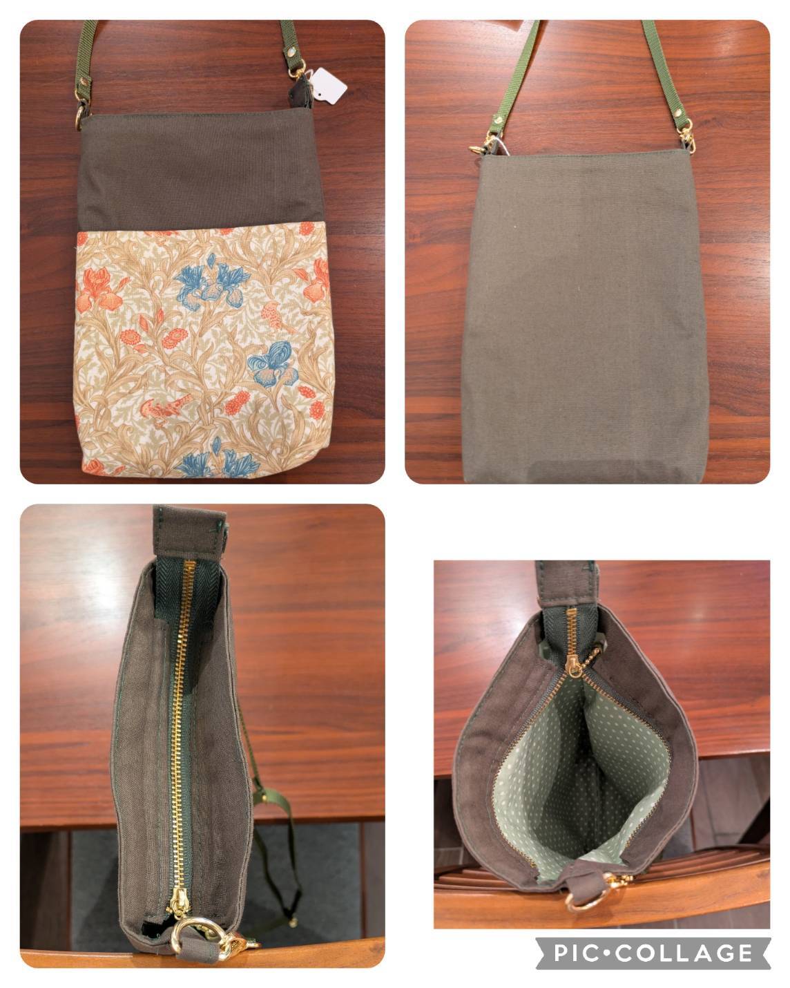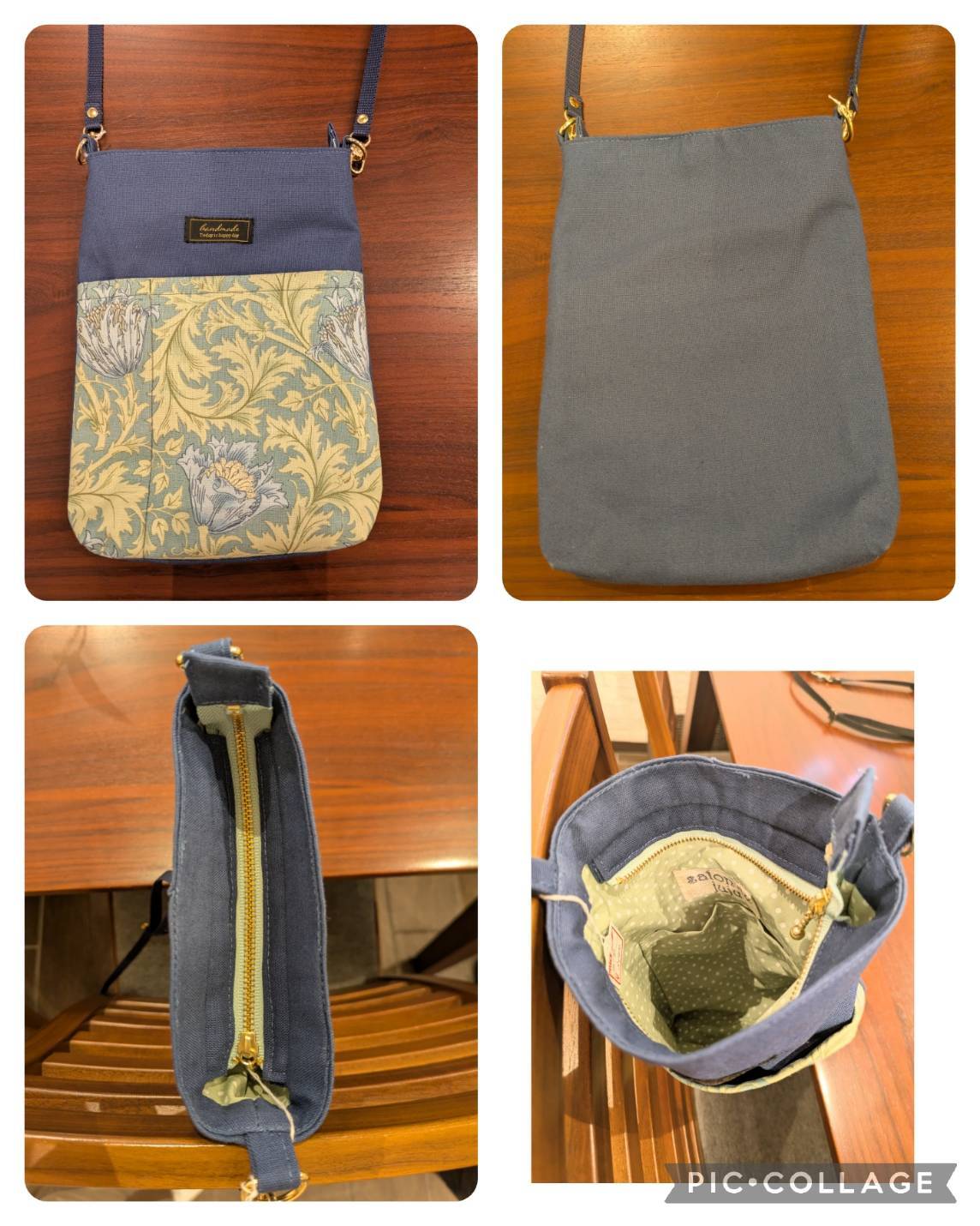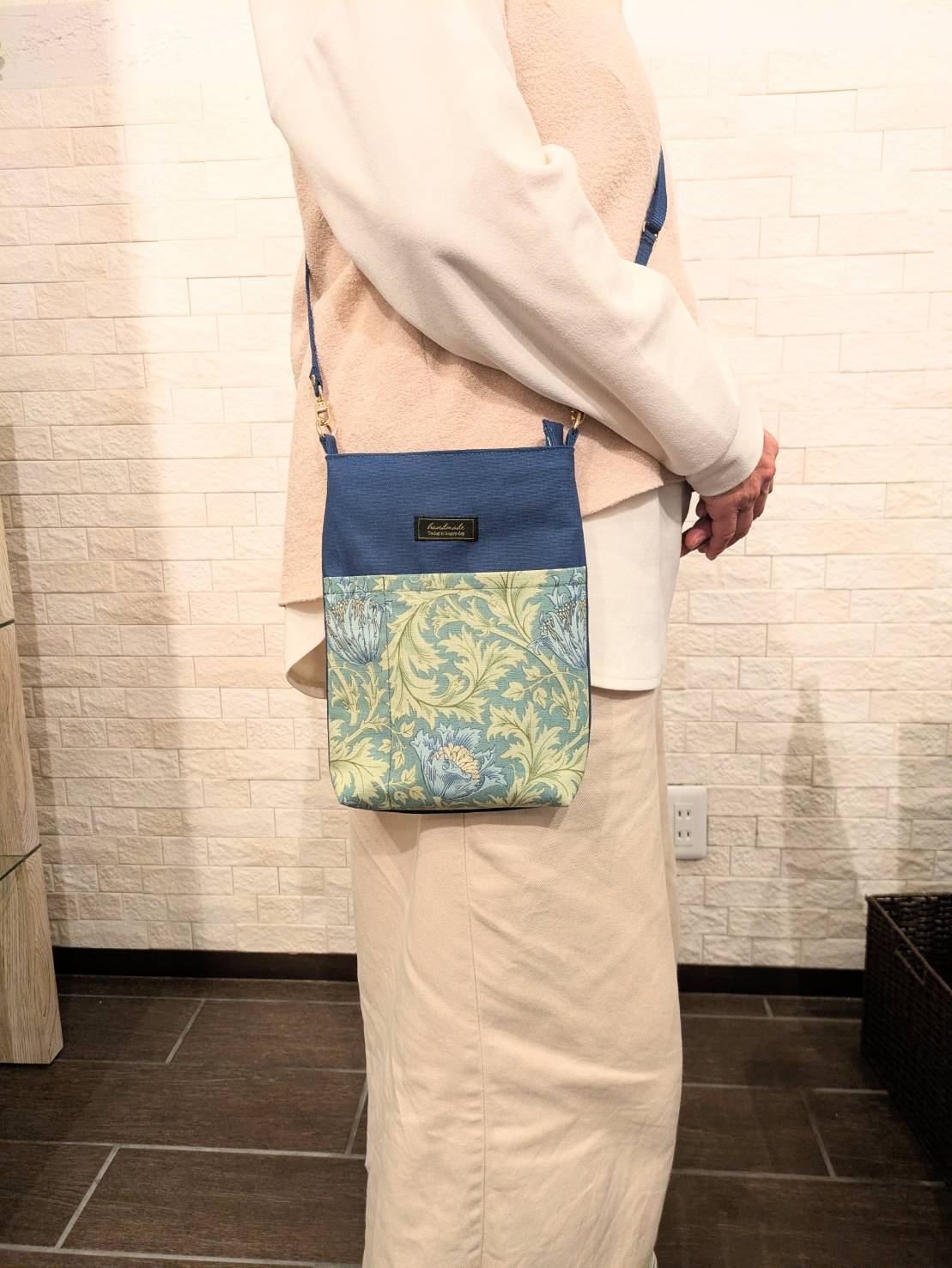 財布、スマホ、眼鏡等が入るお出かけに便利なポシェット。長さ調節が可能なショルダー紐付き。 外ポケットあり、内ポケットあり(注:こげ茶にはありません)