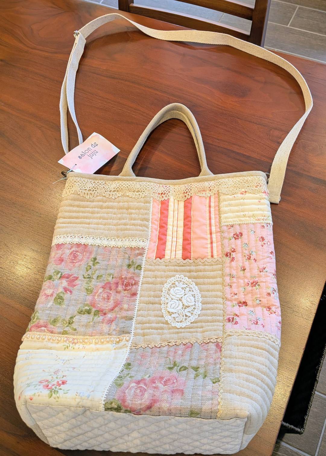 花柄やレースをつないだ優しい雰囲気のバッグです。