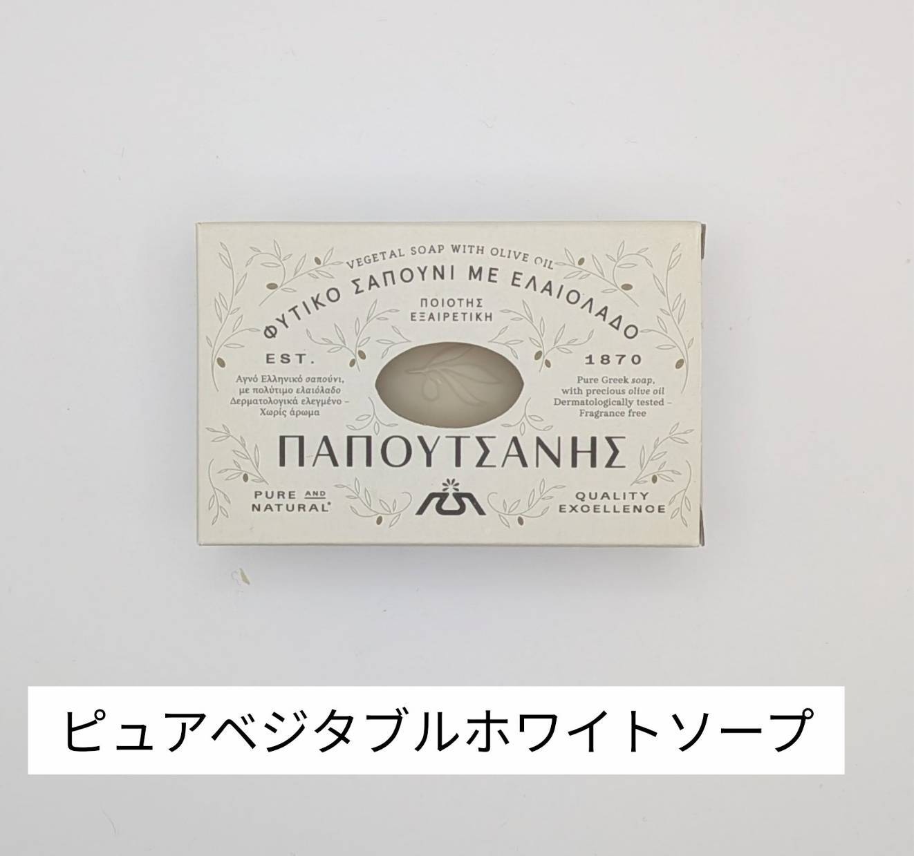 【ピュアベジタルホワイトソープ】ギリシャ産の有機オリーブオイルとパームオイルを配合した、天然成分100%の無添加植物性ソープ。ピュアオリーブオイルソープよりは泡立ちがよくクリーミー。余分な皮脂を落とさずお肌に格別な潤いを与えてくれる。無香料タイプ。洗顔・クレンジング・洗髪にもおススメ。