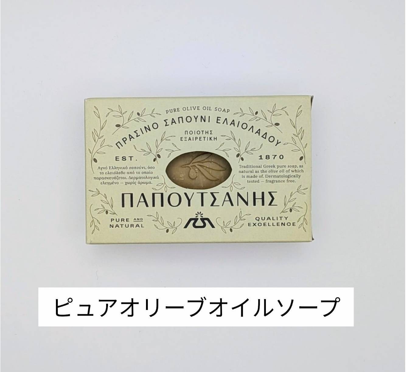 【ピュアオリーブオイルソープ】天然成分100%の無添加オリーブソープ。ギリシャ産のこだわりのオリーブオイルのみを85%以上も贅沢に配合。伝統的な釜焚き製法で作られ、合成成分を一切使用しておらず、オリーブオイルをたっぷりと含んでいるため、余分な皮脂を落としすぎず、洗いあがりのお肌に格別な潤いを与えてくれる。洗顔・クレンジング・洗髪にもおススメ。